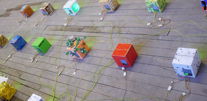 Cardboard Network 2003 Exhibited: Modulate Blowback Launch Flux | The Cardboard Network comprises a series of units linked together via electrical cables that also power the network.