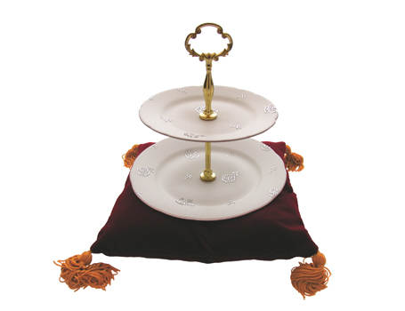 Cake Stand 30/09/2006 Pimped cake stand. 25 x 25 x 25cm (approx.) Cake stand, primer, Swarovski crystals. Velvet cushion, tassles. |