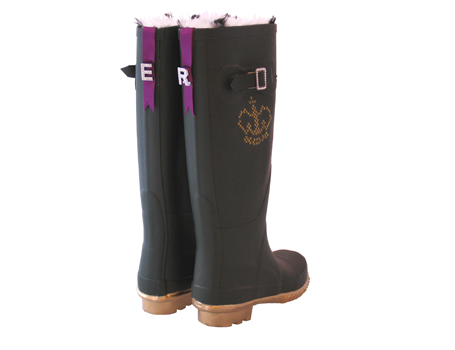 Wellington Boots, gold thread, Swarovski crystals, fake ermine fur, ribbon, diamond letters, gold spray.