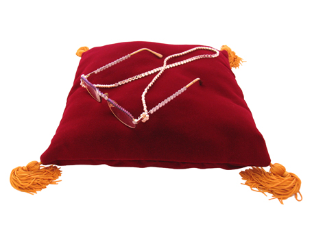 Spectacles 30/09/2006 Pimped specs. 20 x 10cm (approx.) Spectacles, Swarovski crystals, fake pearls, plastic diamonds, gold spray. Velvet cushion, tassles. |