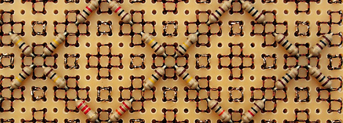 Electronic Embroidery 2003 - 2006 Exhibited: Modulate | Electronic strip board has a perforated surface much like Aida, an even-weave fabric used in traditional cross stitching. Strip board has been used here as a canvas for Black Work - a type of counted-thread embroidery dating back to the Elizabethan period. Resistors and metallic threads have been used in place of embroidery silks.